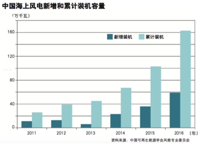 自2010年首個海上風電并網項目上海東海大橋海上風電場建成投產以來,在此后的3年里,江蘇如東3萬千瓦和15萬千瓦潮間帶試驗、示范風電場及其擴建工程陸續建成。2012年底,我國海上風電累計裝機接近40萬千瓦;受各種因素影響,2013年海上風電發展顯著減緩;自2014年以來,我國海上風電裝機迅速增加,當年新增并網容量約20萬千瓦,全部位于江蘇省;2015年新增裝機容量為36萬千瓦,主要分布在江蘇省和福建省;2016年新增裝機154臺,容量達到59萬千瓦。截至2016年底,我國已建成海上風電累計裝機容量162萬千瓦,在全球僅次于英國與德國。我國海上風電占全國風電總裝機容量的比重由2011年的0.42%上升至2016年的0.96%。