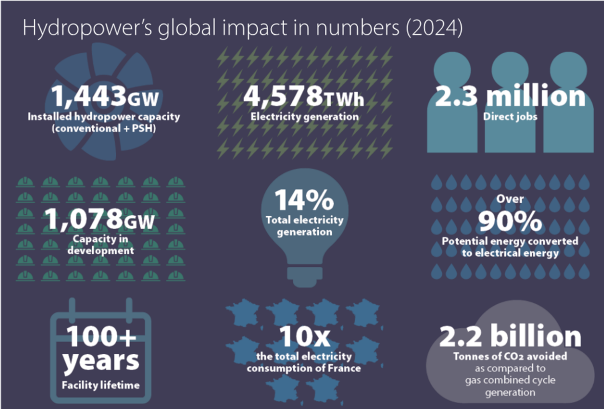 2024年,全球新增水電裝機容量排名前五的國家依次為中國、坦桑尼亞、埃塞俄比亞、不丹和巴基斯坦;全球水電發電量相當于法國總電力消費量的10倍,與燃氣聯合循環發電相比,相當于減排二氧化碳22億噸;水電行業為全球提供了超過230萬個就業崗位。
