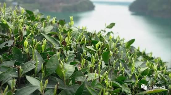高橋村茶園里剛發出嫩芽的茶葉映襯著美麗的清江