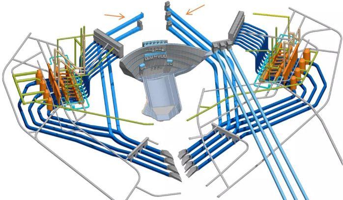 ▲ 在復(fù)雜的地下洞室群中,天藍(lán)色管路為導(dǎo)流洞(白鶴灘工程建設(shè)部供圖)