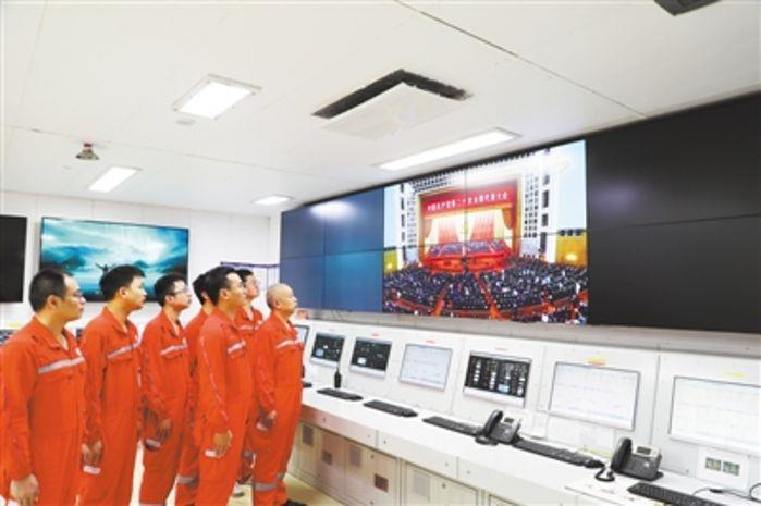 10月16日上午,“深海一號”氣田持續穩定生產作業,現場員工100余人在氣田黨員活動室、餐廳、中控室收看黨的二十大開幕直播。