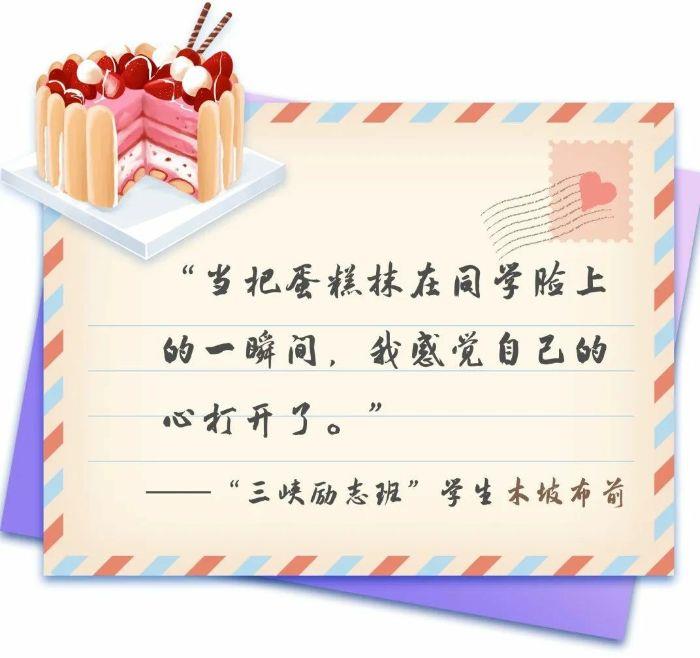 這是木坡布前十三年來過的第一個生日。“同學們都特別開心,鬧成一團,還用手指頭蘸上蛋糕上的奶油互相在臉上涂抹,” 木坡布前對那一天的場景記憶猶新,“我也被歡樂的氣氛感染了,學著同學們的樣子,我也把奶油抹到了同學臉上,那一瞬間,我感覺我和同學們的距離一下子拉近了。”第一次過生日,第一次游學,第一次演講……木坡布前在“三峽勵志班”遇到了很多個人生“第一次”,漸漸打開了曾經封閉的心靈。課堂上,他舉手發言的次數多了起來;小組中,他參與討論的聲音也高了起來。以前,一道不會的數學題,木坡布前要花上幾個小時的時間自己想,現在他會主動尋求老師和同學的幫助,很快就弄明白了。