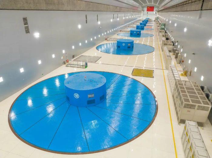 在“迷宮”中乘車繞行大約3分鐘后,記者抵達了左岸廠房,見到了9臺單機容量77萬千瓦水輪發電機組。在金沙江的另一側,還有9臺機組對稱布置。
